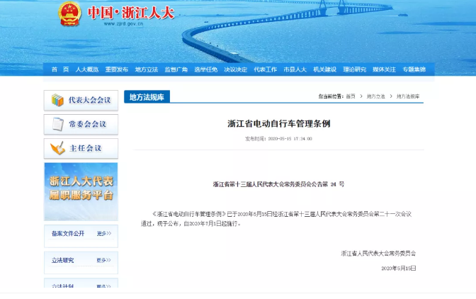 5月15日下午,《浙江省电动自行车管理条例》(以下简称《条例》)通过省十三届人大常委会第二十一次会议审议,将于2020年7月1日正式实施。...