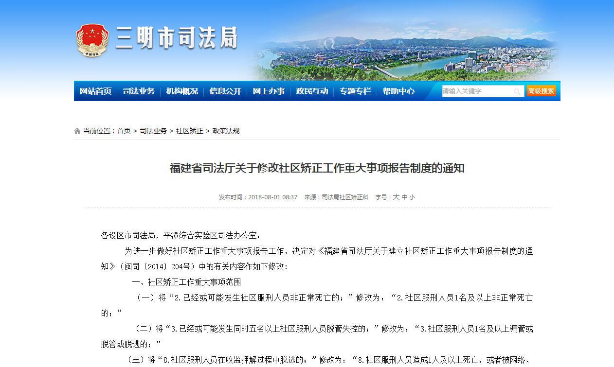 为进一步做好社区矫正工作重大事项报告工作,决定对《福建省司法厅关于建立社区矫正工作重大事项报告制度的通知》(闽司〔2014〕204号)中的有关内容作如下修改: ...